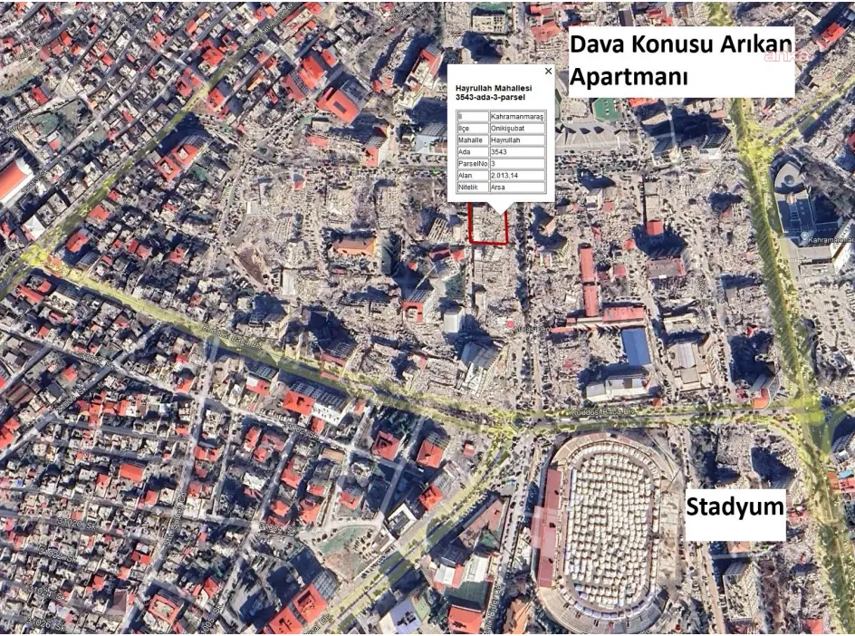 Bilirkişi raporunda, Kahramanmaraş İl Afet ve Acil Durum Müdürlüğü tarafından hazırlanan “Kahramanmaraş İl Afet Risk Azaltma Planı (İRAP) 2020” raporunun 43. sayfasında, stadyum ve çevresi olarak belirtilen riskli alanın dava konusu Arıkan Sitesi’nin yakın çevresinde yer aldığı ifade edildi.