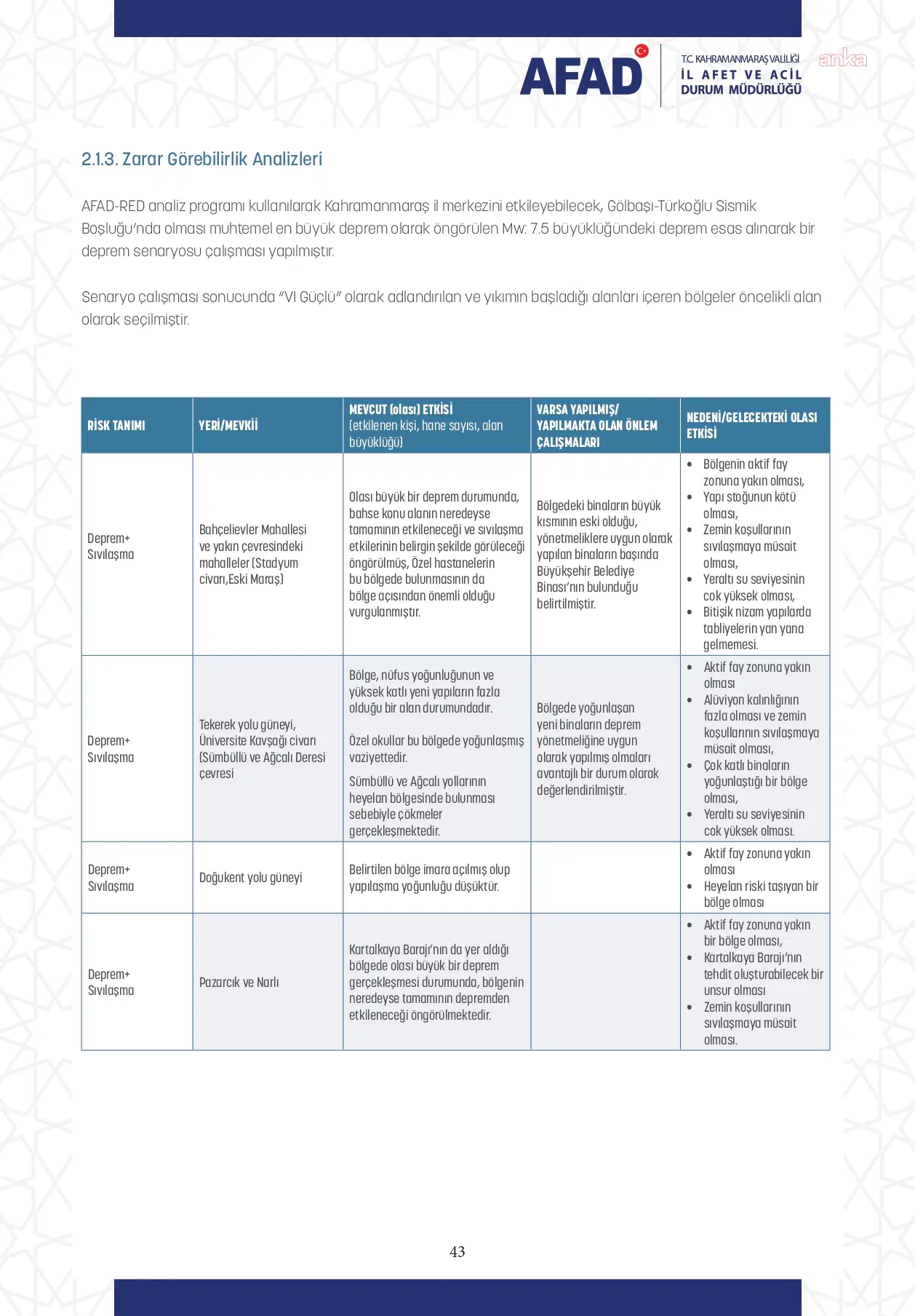 Raporda, “Kahramanmaraş’ta 7,5 büyüklüğünde bir deprem senaryosu” esas alındı. Raporun “Zarar görebilirlik analizleri” başlığında; risk tanımı, riskli alanların konumu, depremin olası etkileri, yürütülen önlem çalışmaları ile gelecekte ortaya çıkabilecek etkiler değerlendirildi.