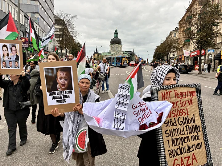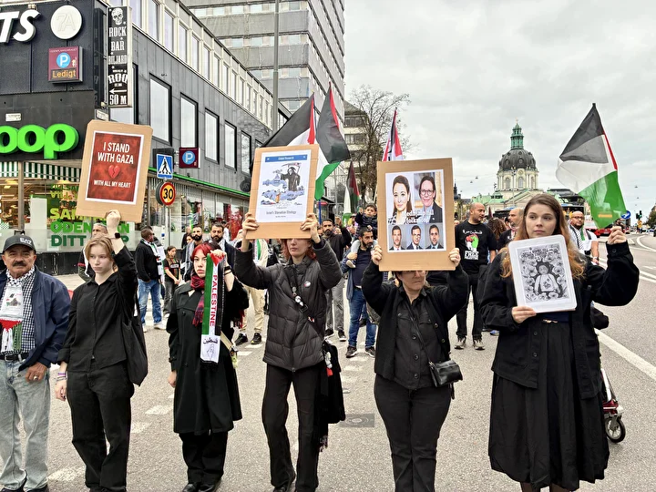 “Bu bir savaş değil, soykırım”, “Özgür Filistin”, “Katil İsrail”, “Direniş, özgürlük, adalet ve yeniden yapılanma” sloganları atan İsveçliler “Soykırımı durdurun” mesajı verdi.